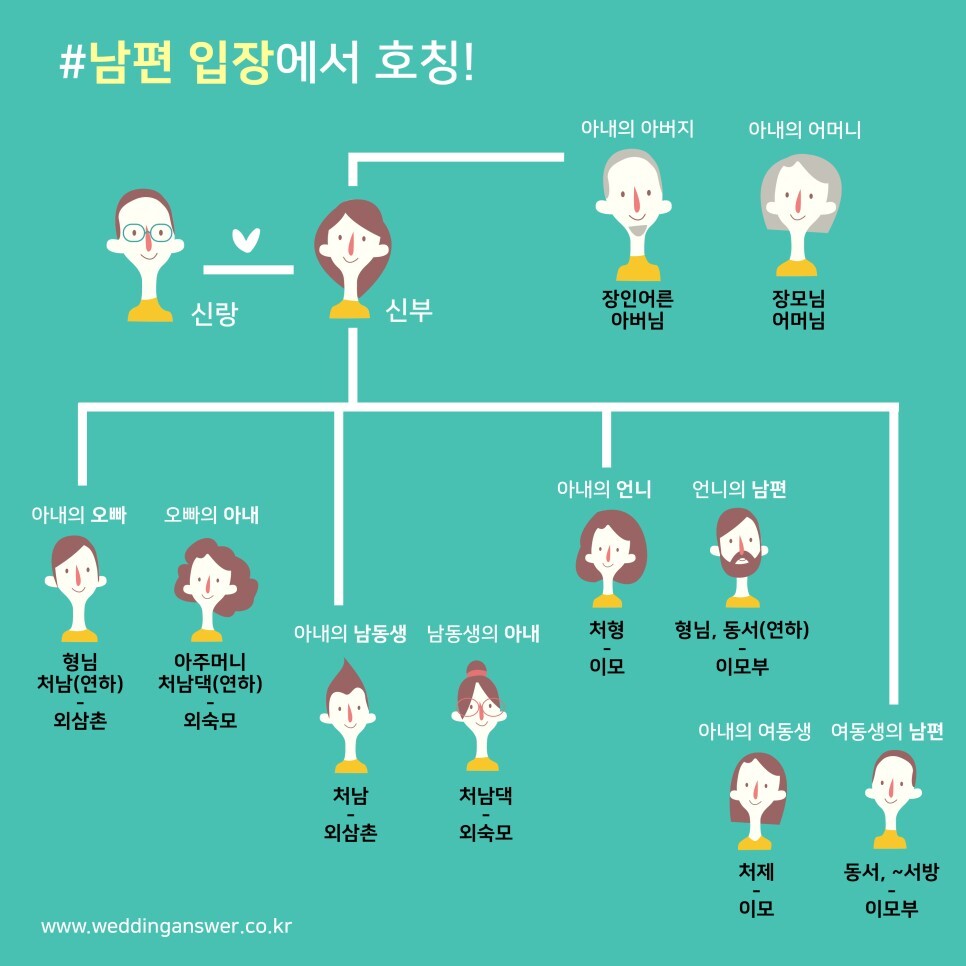 아무래도 아내쪽 호칭이 많이 헥갈린 편인데요. 결혼한지 얼마 안된 신혼부부의 경우는 이쪽 호칭을 유심히 기억해 두시는 편이 좋을 거 같습니다. 평소 자주 사용하지 않아 호칭이 많이 낯설어요.