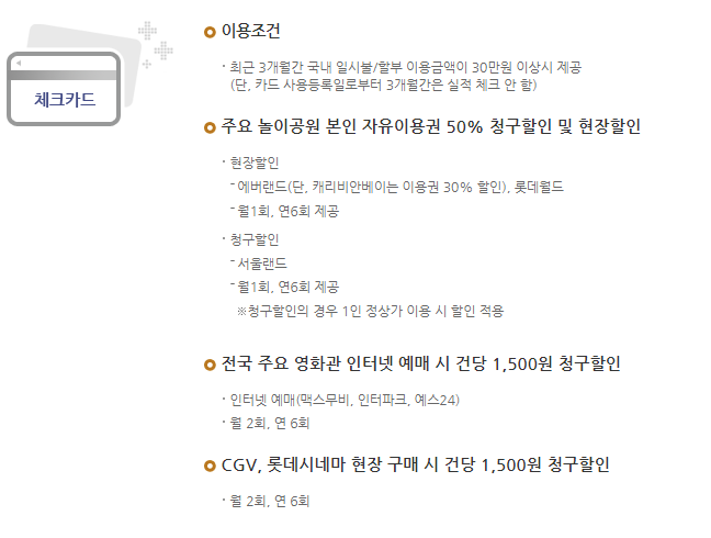 체크카드를 사용할 때는 주요 놀이공원에서 자유이용권 할인 혜택을 받을 수 있습니다.