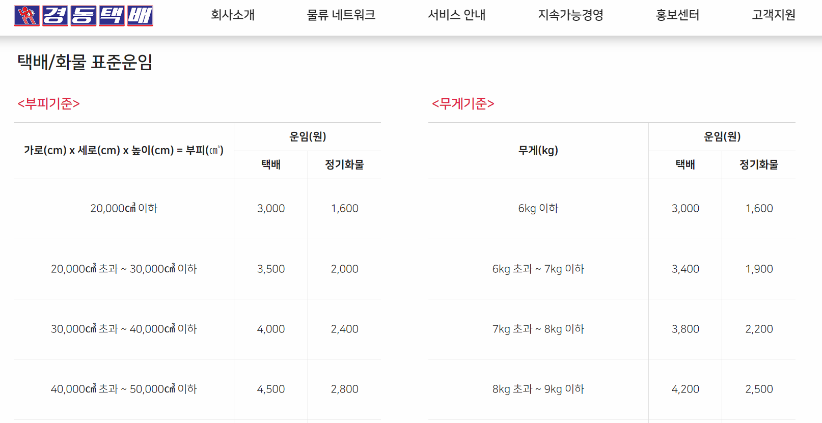 무게 기준으로 6kg 이하면, 택배 3000원, 정기화물 6000원으로 운임이 책정되어 있습니다.
