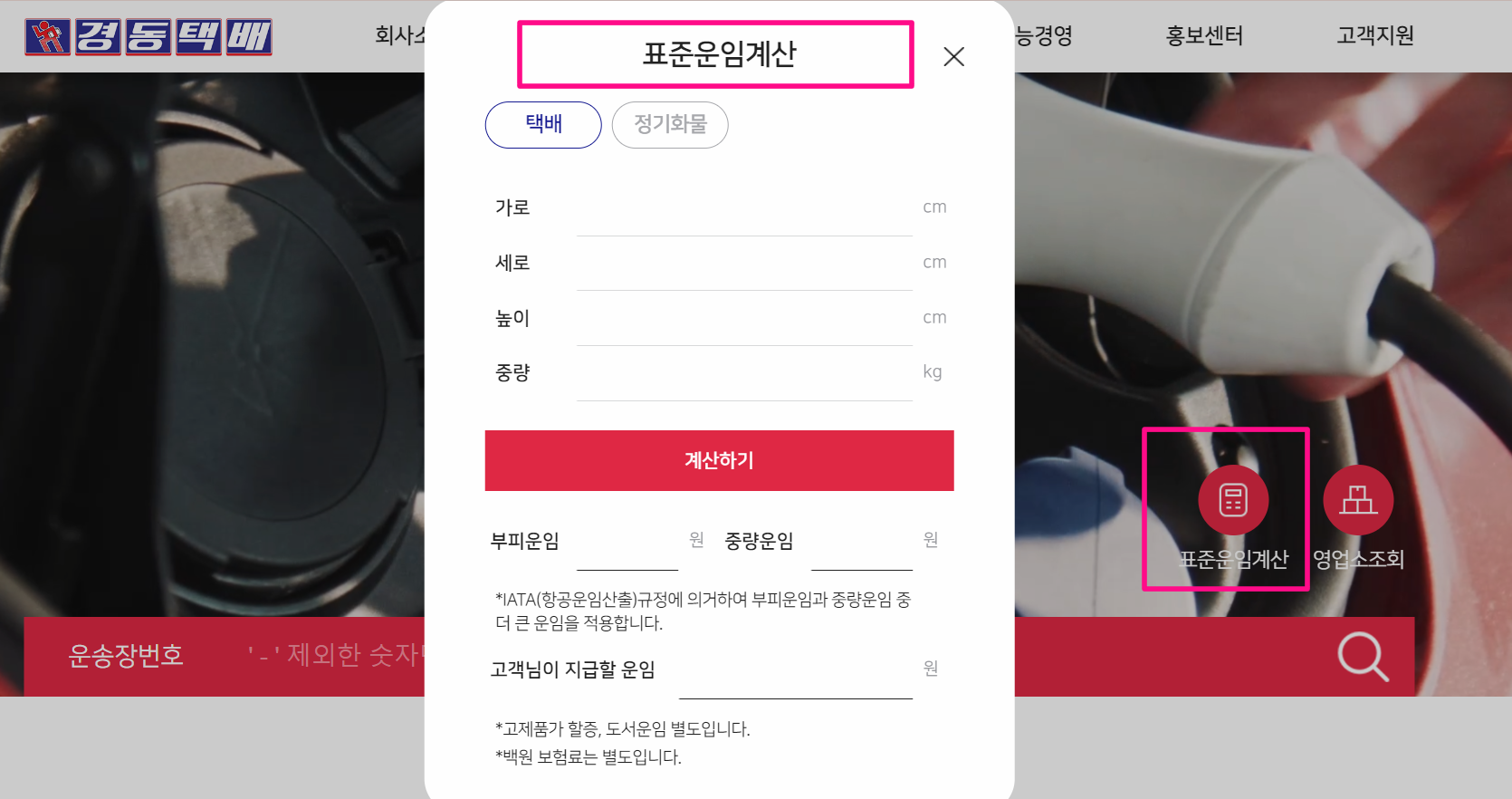 아래 바로가기 링크를 통해 경동택배로 이동한 다음 아래 표준운임계산하기를 눌러 주세요.