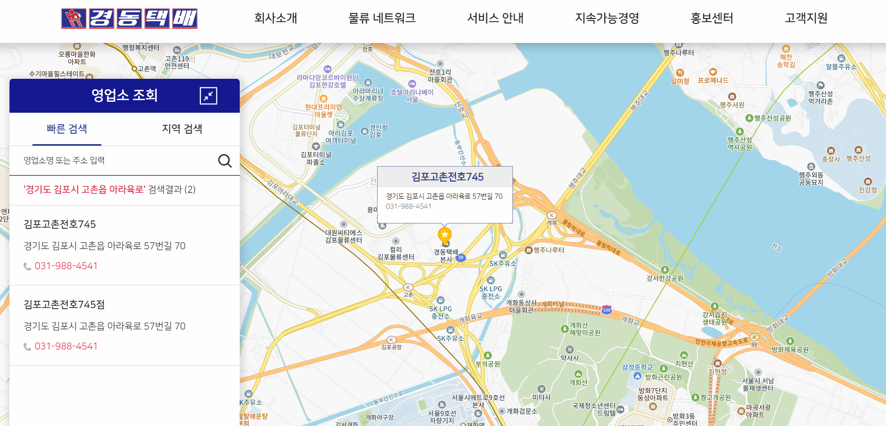 경동택배 홈페이지에 접속을 해 주세요. 물류 네트워크 -> 영업소 위치 클릭