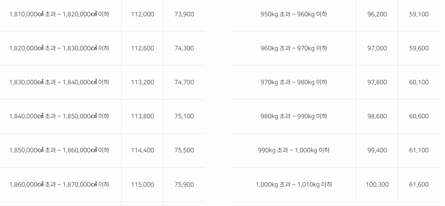 부피기준으로 가로x세로x높이 20,000cm 이하는 3000원, 1600원의 택배와 정기화물로 구분되네요.