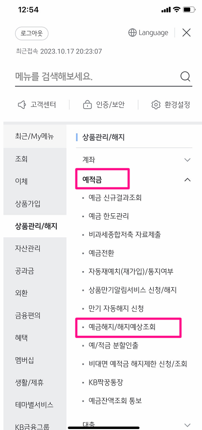 [ KB스타뱅킹 앱 실행 > 전체메뉴 > 뱅킹 > 상품관리/해지 > 예적금 > "예금해지/해지예상조회" ]