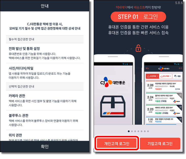 위에서 CJ 대한통운 앱을 설치하고 실행해 주세요.