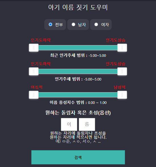 남자와 여자아이의 이름을 짓도록 도와주는 기능도 포함되어 있습니다. 최근 인기추세나 다양한 옵션을 범위로 지정하고 돌림자를 입력하면 원하는 이름들을 추천해서 검색해 주는 서비스 인데요.