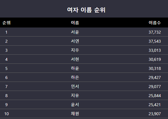 남자아이 이름의 경우 민준, 서준, 도윤 순으로 이름수가 많은 걸 확인하실 수 있습니다.