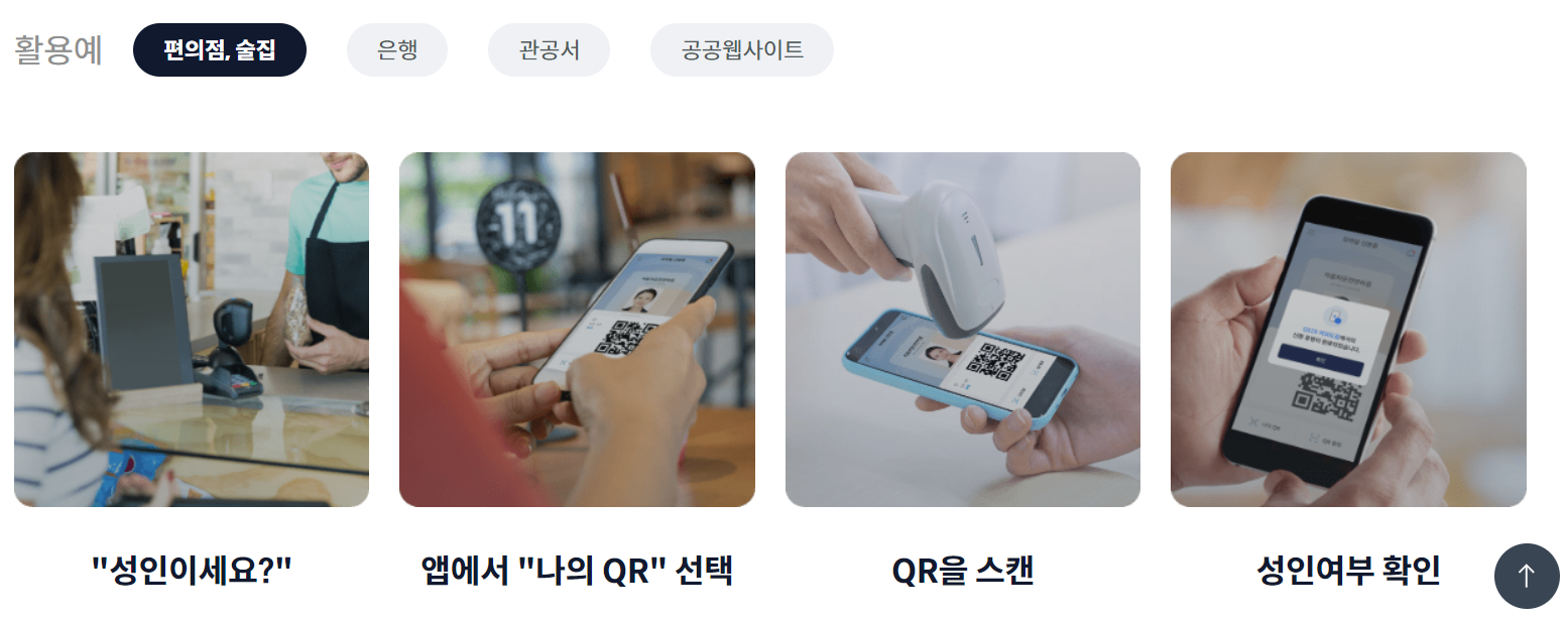 성인임을 인증해야 하는 장소에서 핸드폰 앱을 열고 나의 QR을 선택하고 QR코드 스캔을 통해 간단히 성인임을 인증하실 수 있어요.