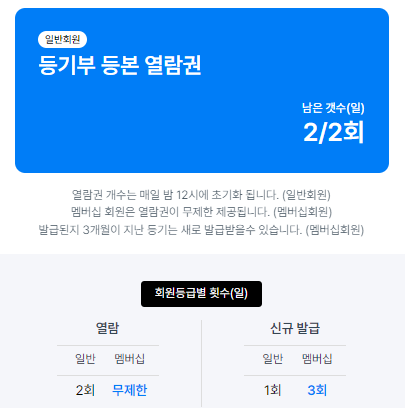 하루에 2회까지 무료로 등기부등본을 조회하는 서비스를 제공하고 있어 저도 종종 이용하고 있는 사이트입니다.