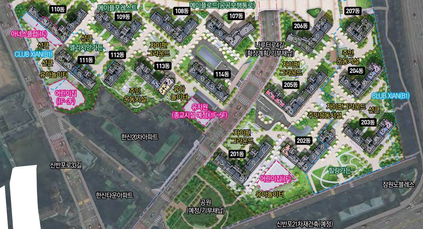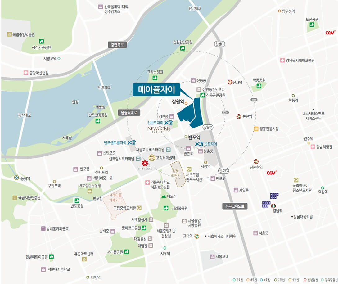 메이플자이는 지하철 노선도만 보아도 다릅니다. 3, 7, 9, 신분당선이 모두 도보권으로 교통이 매우 편리하며 고터, 신세계백화점, 서울 성모병원이 근접해 있는 요충지라 생각이 됩니다. 정말 살고 싶은 단지네요.