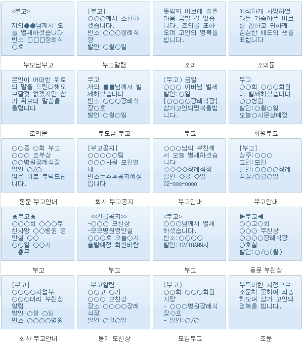 부고장, 조의문을 문자로 보낼 때 참고할만한 예시를 몇 가지 보여드리겠습니다.