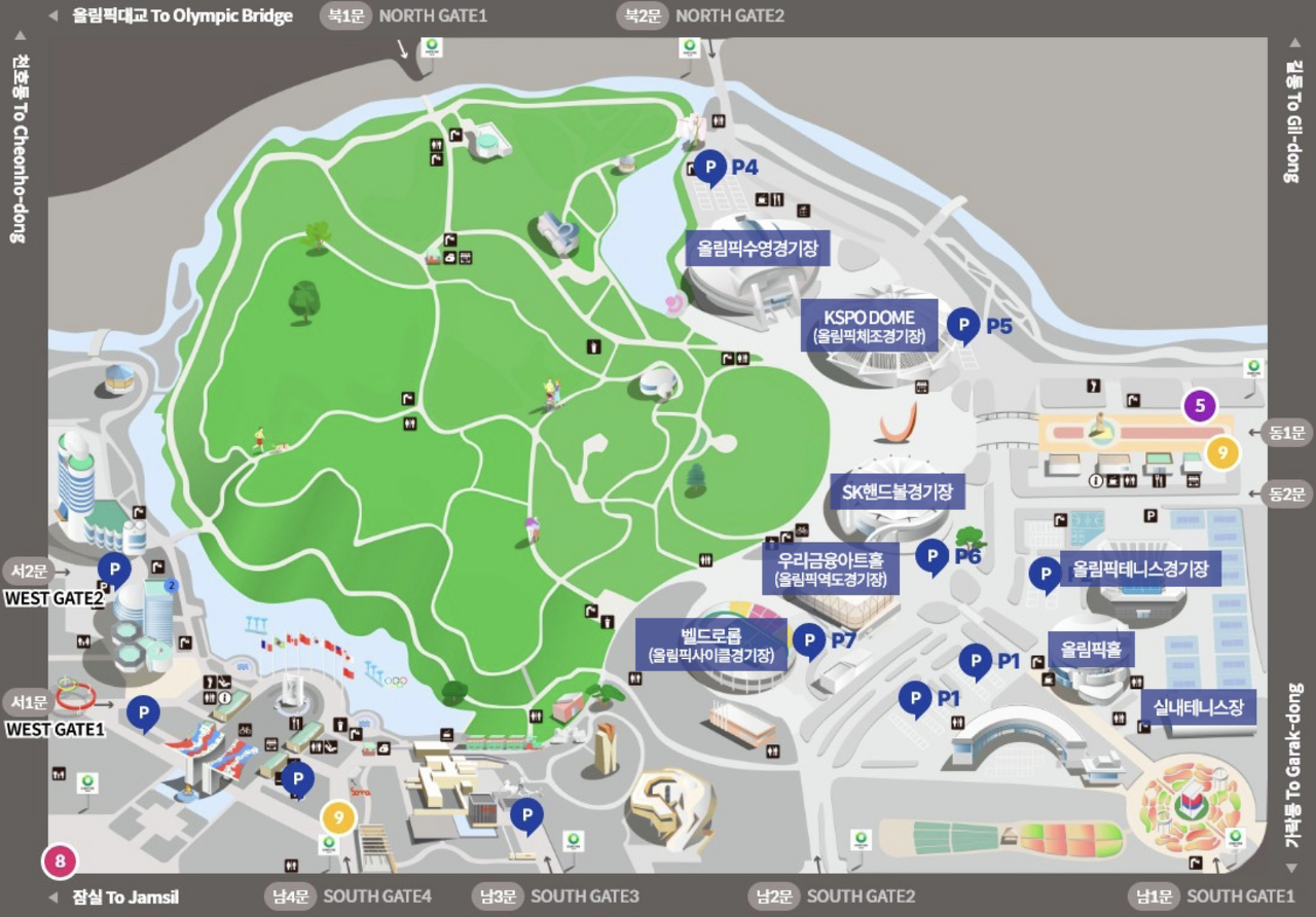 올림픽홀 바로 옆에 있으며 가장 가까운 주차장은 P1 입니다. 아래 지도상에 첨부를 해 두었습니다 ^^