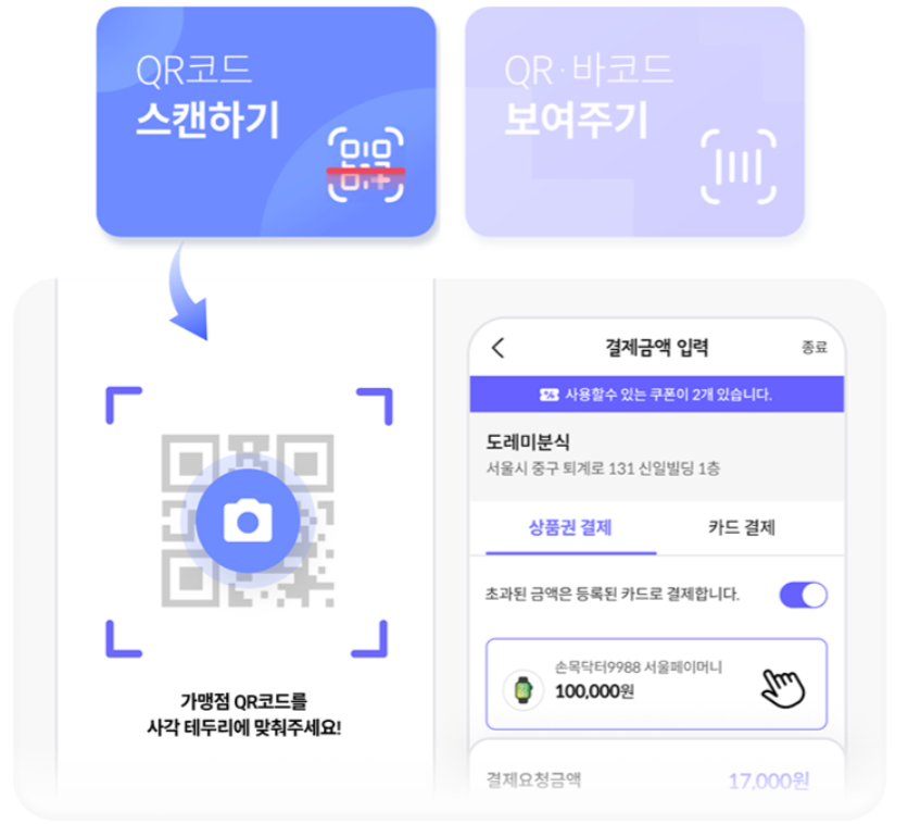 혹은 나의 QR코드 혹은 바코드를 가맹점 점원에게 보여주시면 됩니다.