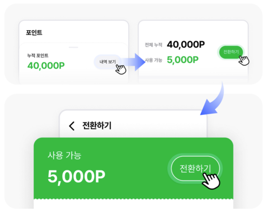 건강활동을 통해 5000포인트 이상 모아야 포인트 전환이 가능합니다. 포인트 내역 화면에서 전환하기 버튼을 클릭해 전환 신청을 하실 수 있습니다.