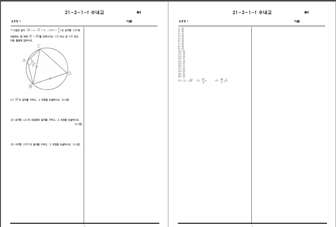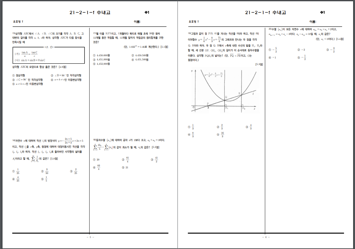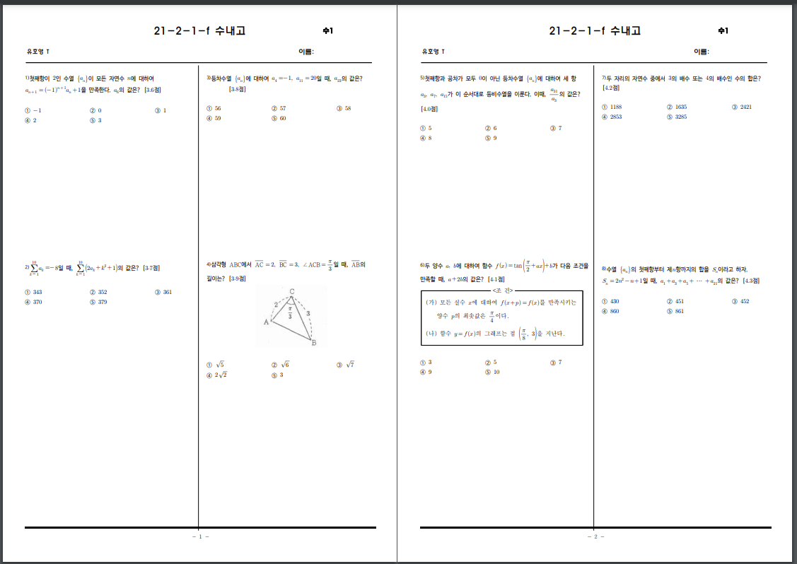 수내고등학교 21년 2학년 1학기 기말고사 수1 시험지 무료 다운