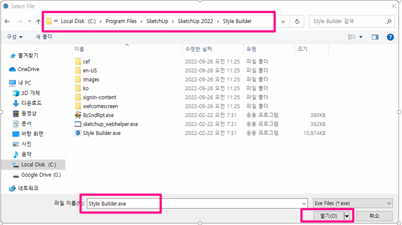 파일이름에 Style Builder.exe를 직접 입력하고 열기를 클릭합니다.
