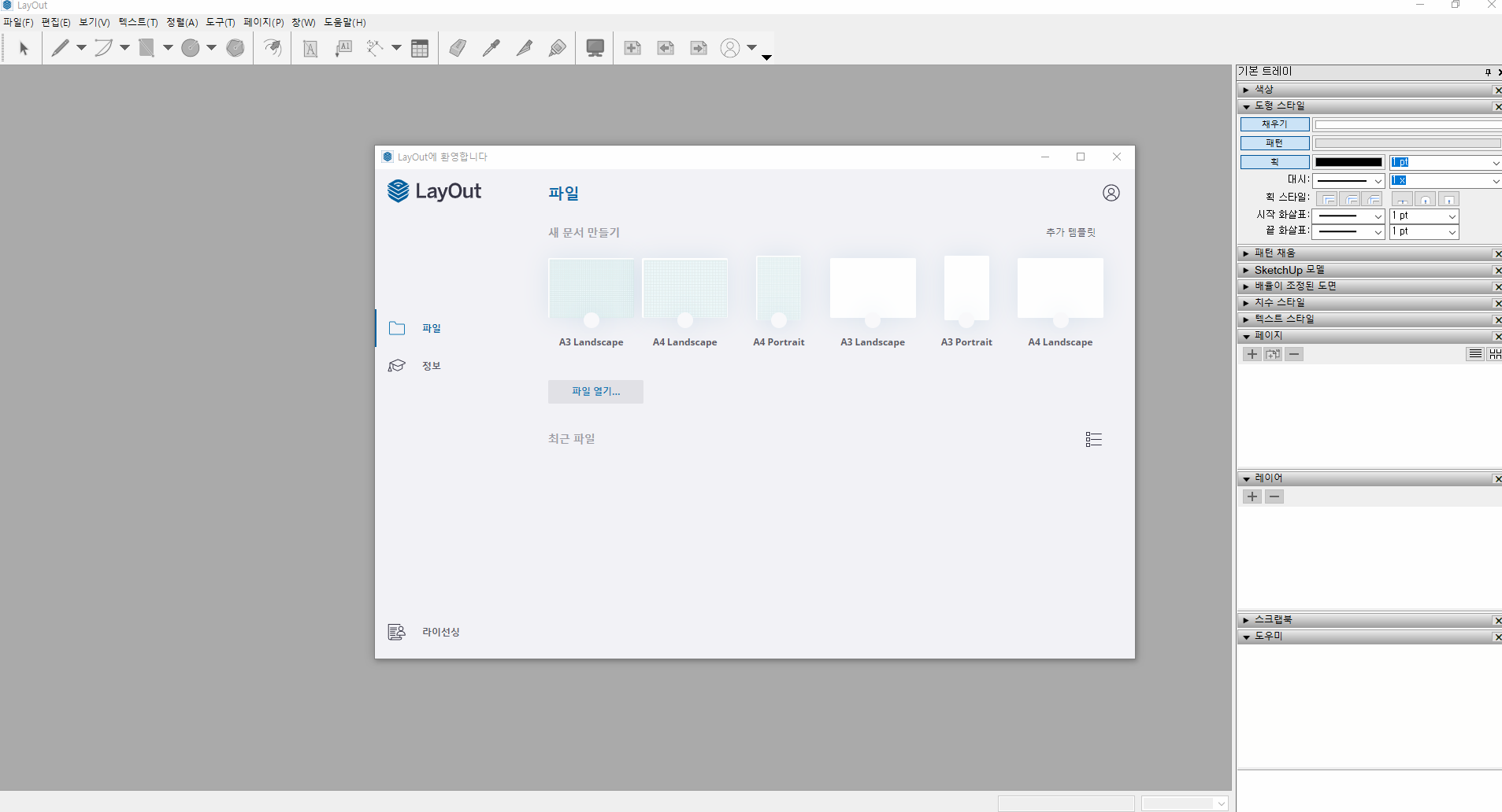 스케치업 Layout.exe 실행 완료 화면입니다!!