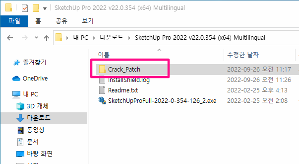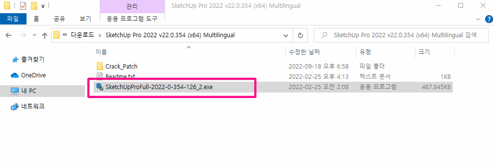 다운로드한 파일을 압축을 풀고 SketchUpProFull-2022-0-354-126_2.exe 를 클릭하여 실행해 주세요.