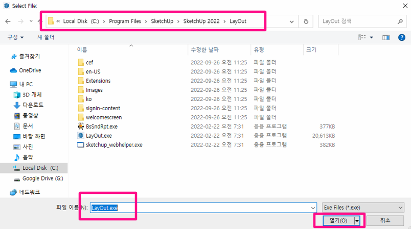 해당 경로에서 파일이름에 LayOut.exe를 직접 입력하고 열기를 클릭합니다.