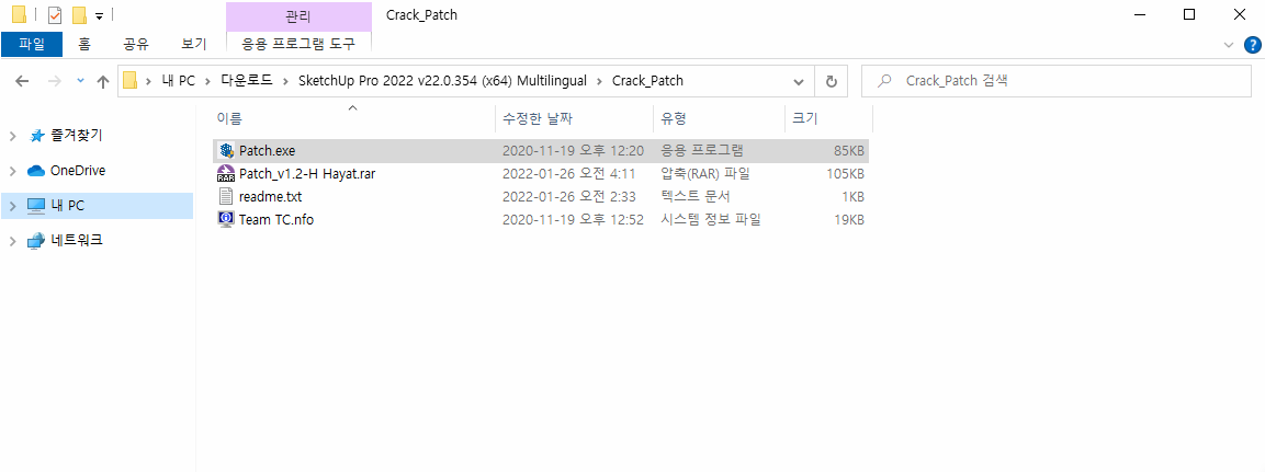 스케치업 설치기 완료되면 정품 인증을 위해 패치 파일을 적용하는 과정입니다.