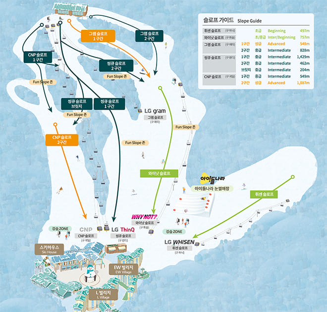 난이도별로 1~7개의 슬로프로 구성되어 총 15개 종류의 슬로프를 보유하고 있습니다.