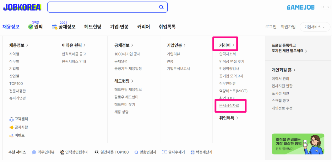 위 링크를 통해 접속한 커리어 -> 문서서식자료로 이동합니다.
