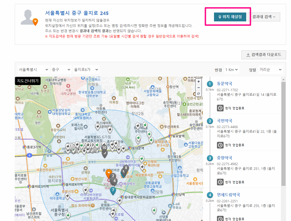 하단에 표시된 위치 재설정 버튼을 클릭하면 내 위치를 자동으로 검색해서 가장 가까운 당직약국 정보를 지도에 표시해 줍니다.