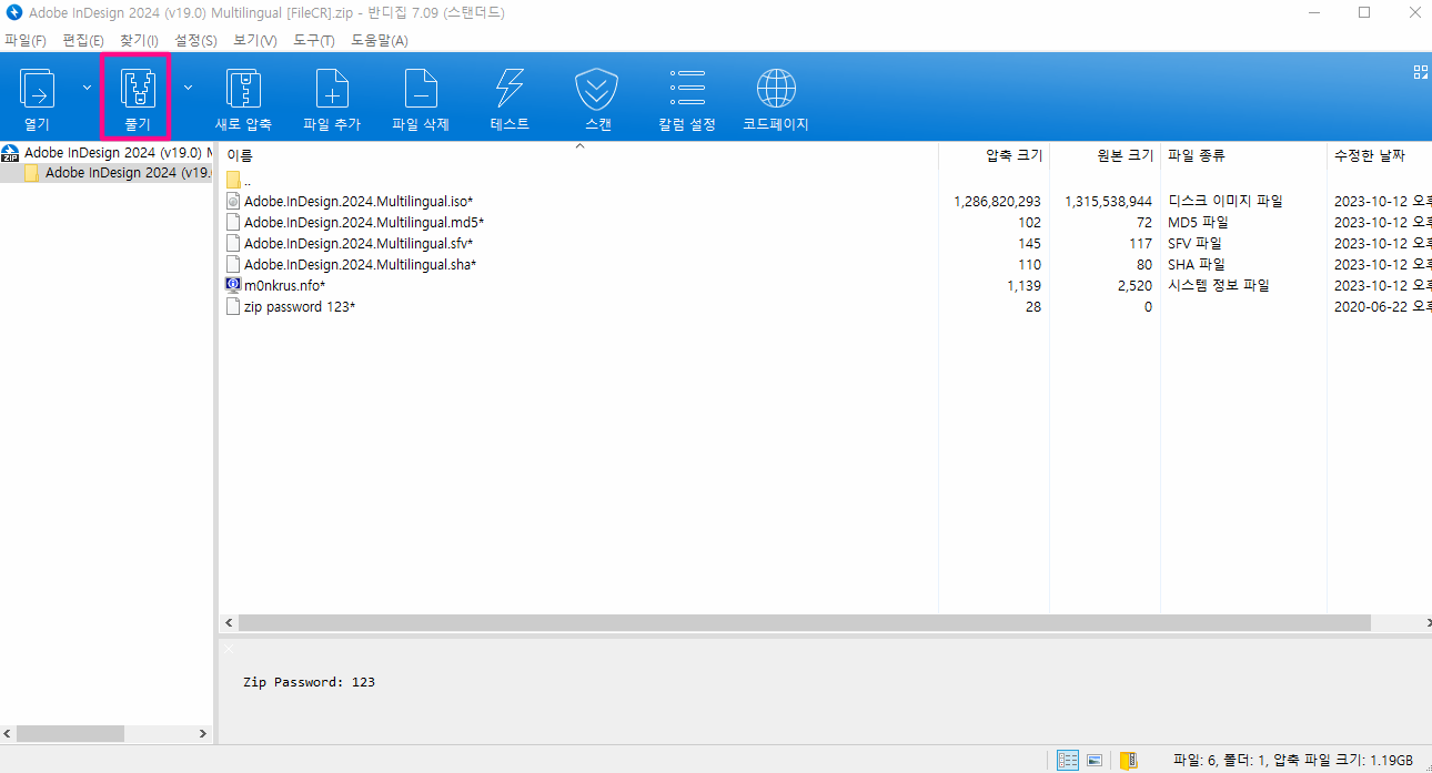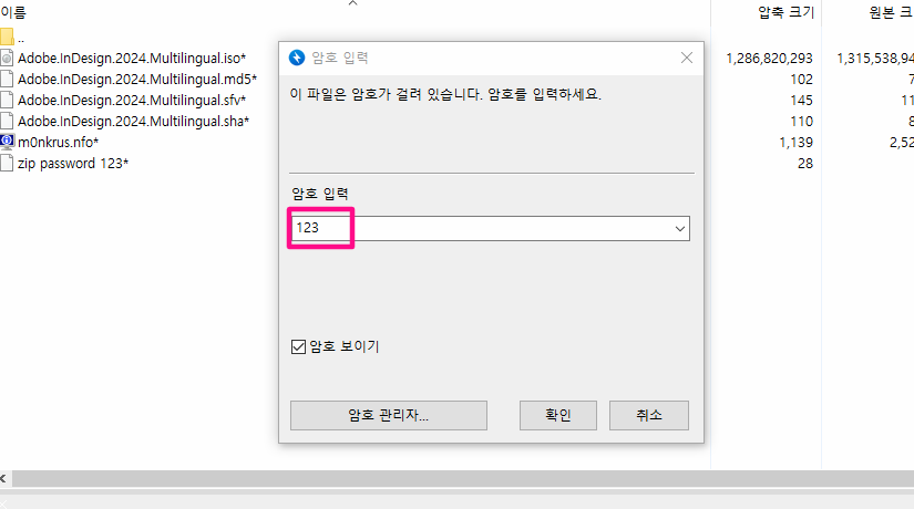 123을 입력해 주시면 압축해제가 완료됩니다.