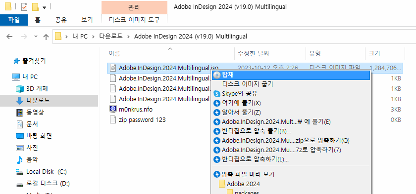 해당 폴더로 이동해서 ISO 파일에 마우스 우클릭 -> 탑재를 클릭합니다.