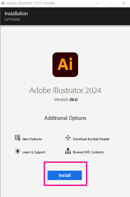 adobe illustrator 2024 installer가 실행됩니다. Install을 클릭합니다.