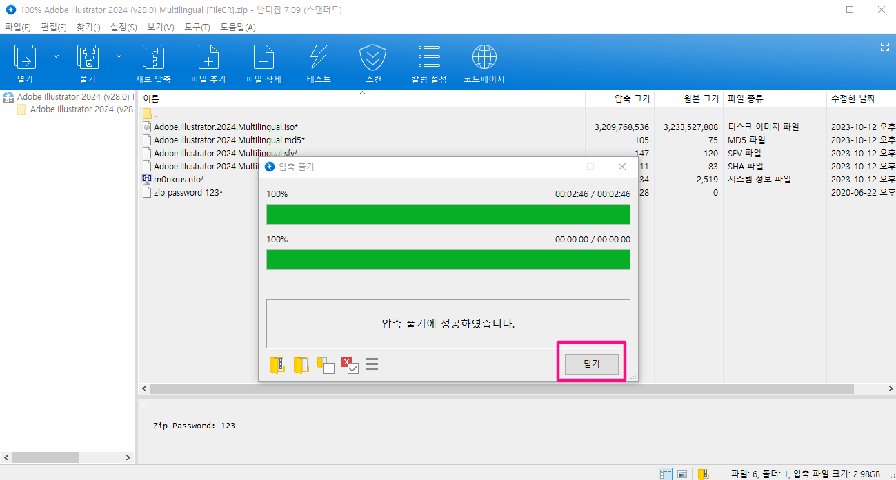 압축 풀기에 성공하였다면 닫기를 클릭하세요.