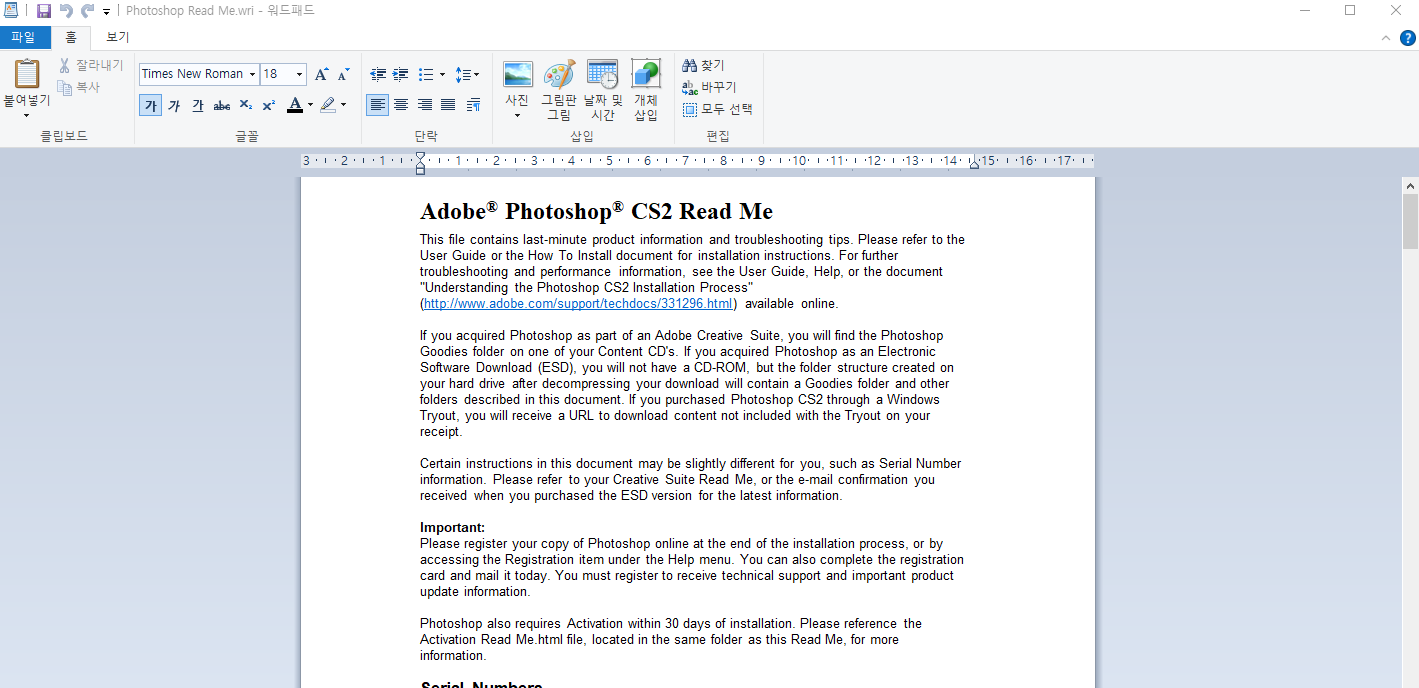 설치가 완료되니 워드패드에 어도비 포토샵에 대한 설명을 담은 파일이 자동으로 열리네요.