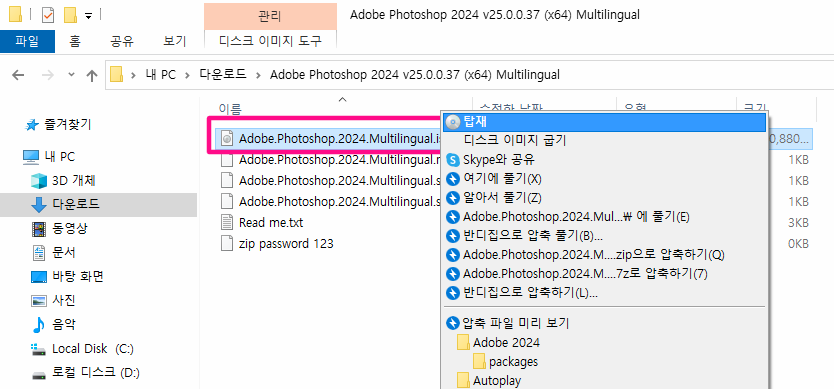 해당 폴더로 이동해서 ISO 파일에 마우스 우클릭 -> 탑재를 클릭합니다.
