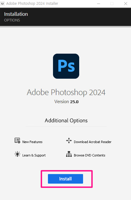 adobe 포토샵 2024 installer가 실행됩니다. Install을 클릭합니다.