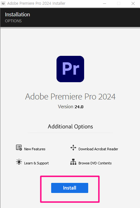 adobe Premiere pro 2024 installer가 실행됩니다. Install을 클릭합니다.