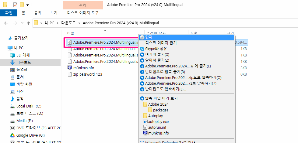 해당 폴더로 이동해서 ISO 파일에 마우스 우클릭 -> 탑재를 클릭합니다.
