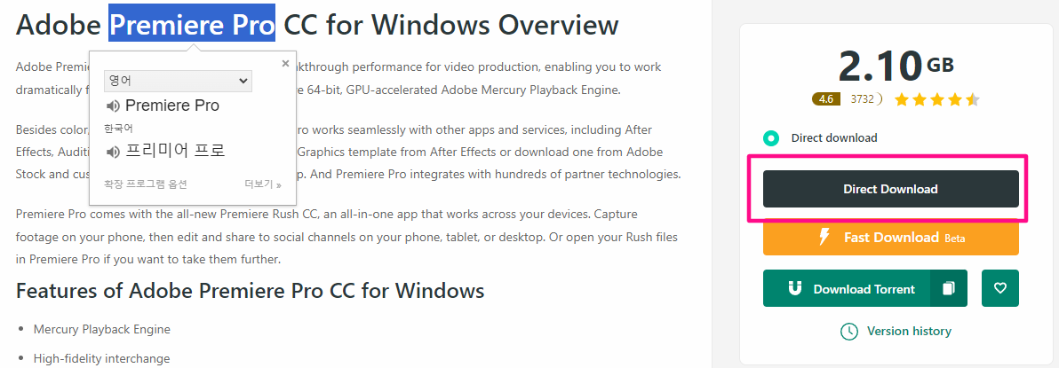 오른쪽 하단에 다이렉트 다운로드를 클릭해서 다운로드를 진행해 주세요.