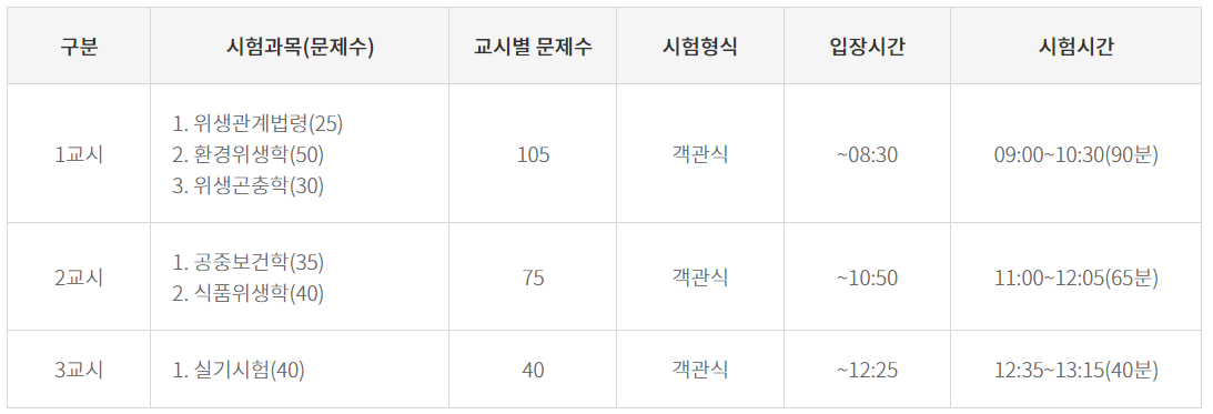 시험은 1, 2, 3교시에 걸처 진행되며 위생관계법령, 환경위생학, 위생곤충학, 공중보건학, 식품위생학, 실기시험을 각 교시별로 응시하게 됩니다.