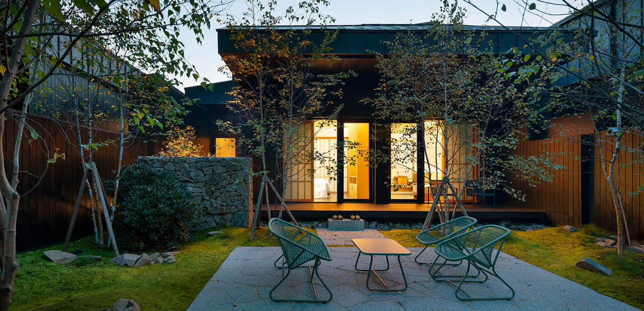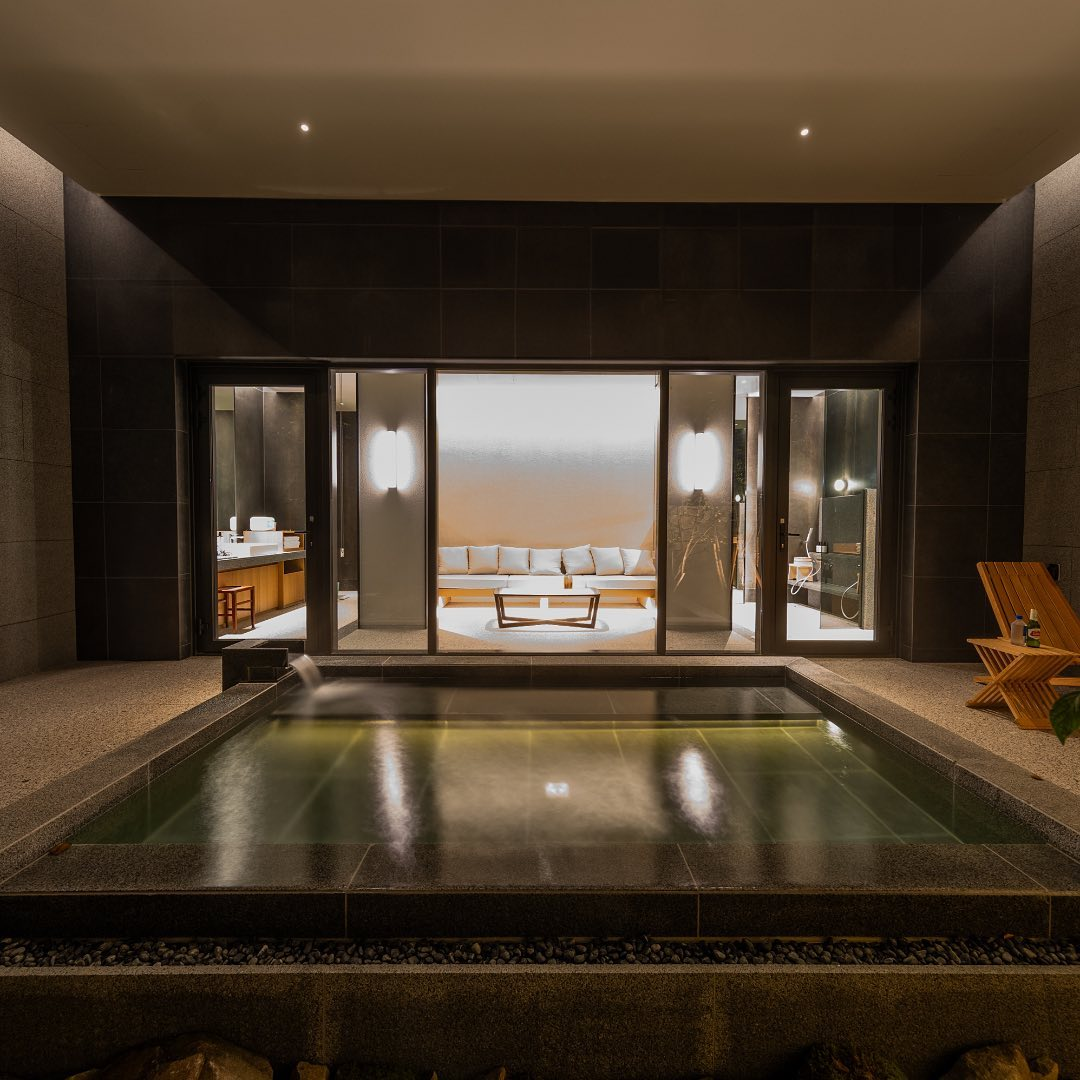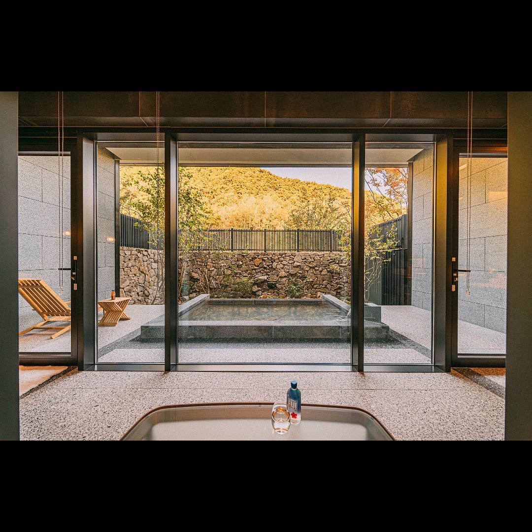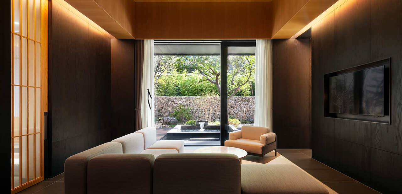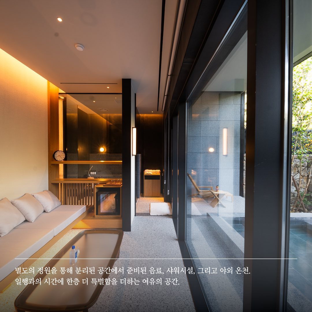 차분한 인테리어가 돋보이는 객실로 객실안에 온천을 즐길 수 있는 노천탕이 포함되어 있는 객실입니다. 아늑하고 따듯한 분위기를 느낄 수 있는 정원이 있고, 거실이 통창으로 구성이돠어 있어 실내에서 멋진 풍경을 감상하실 수 있어요.