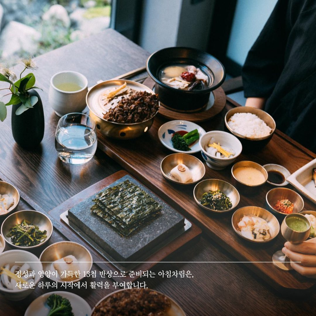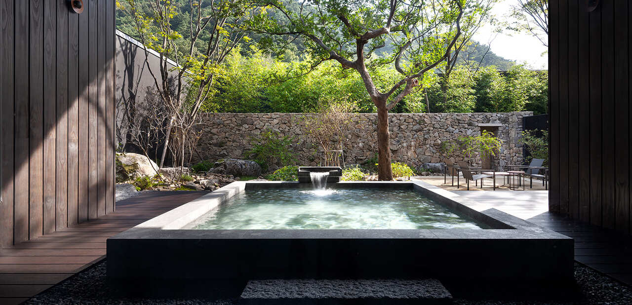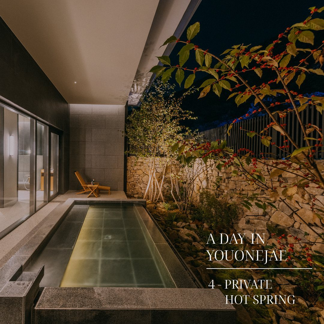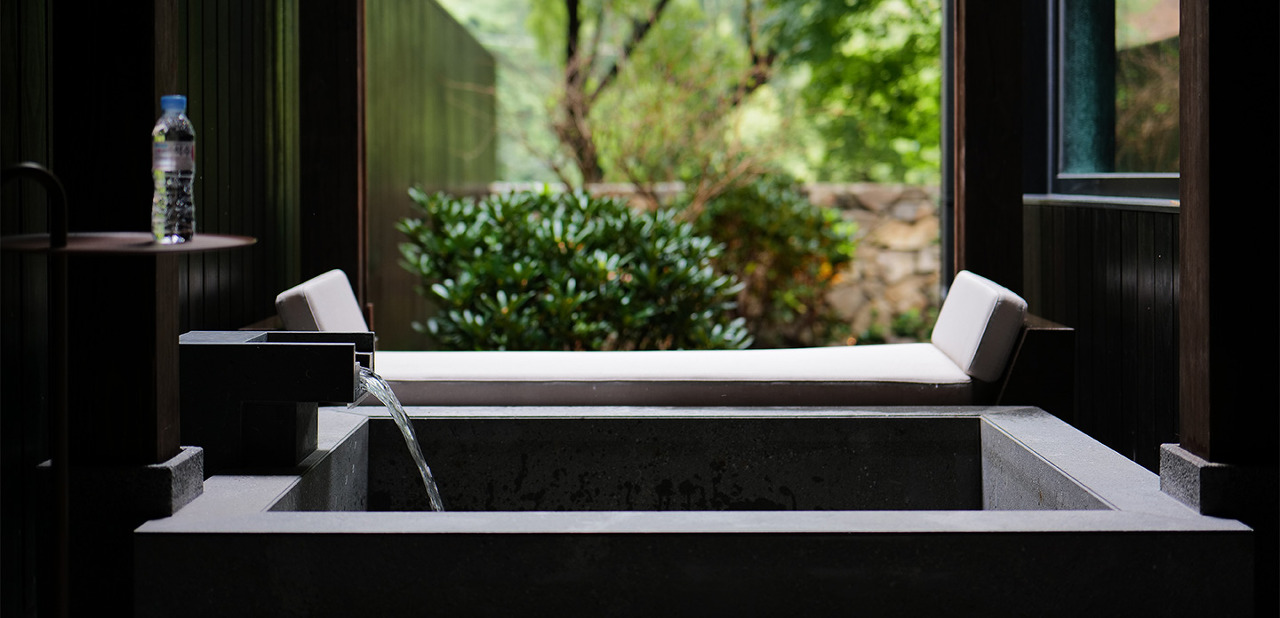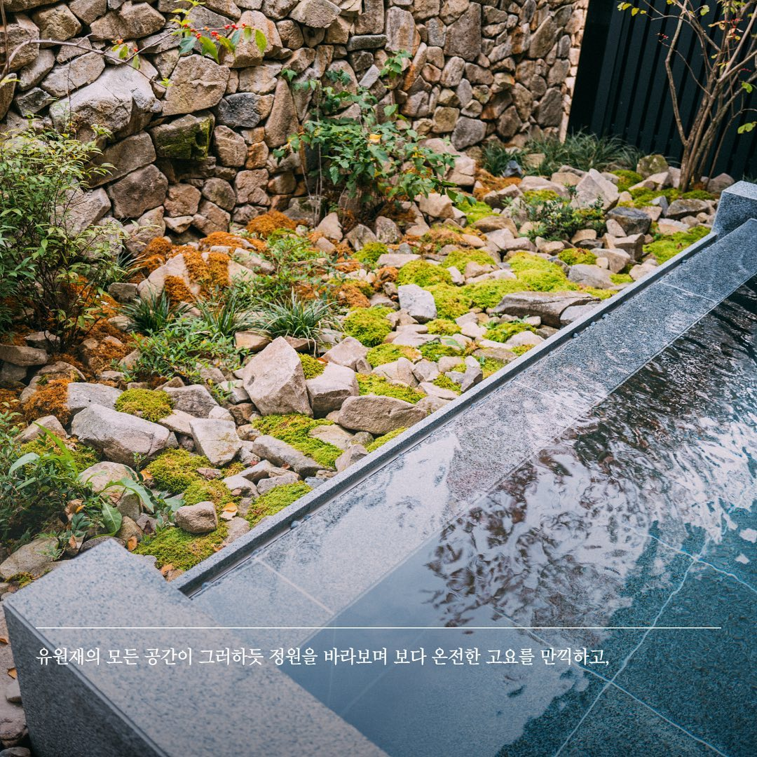 별도의 정원을 통해 분리된 공간에서 경험하는 준비된 음료, 샤워시설, 그리고 야외 온천. 일행과의 시간에 한층 더 특별함을 더하는 여유의 공간. 유원재의 모든 공간이 그러하듯 마련된 정원을 바라보며 보다 온전한 고요를 만끽하고, 온천욕 후 준비된 음료를 여유롭게 즐기며 아무런 걱정 없이 주변 산세와 어우러지는 정원을 바라보며 사색을 즐기는 시간을 만끽하실 수 있다라고 설명이 되어 있습니다.