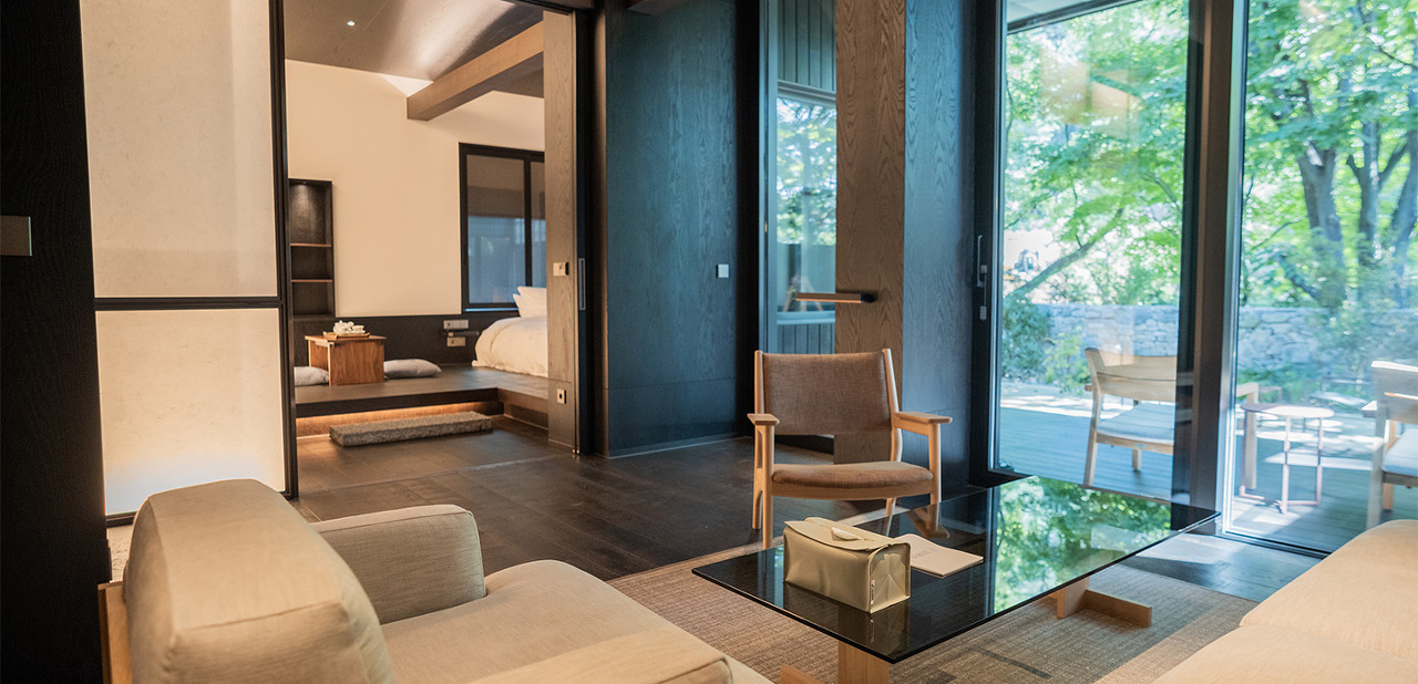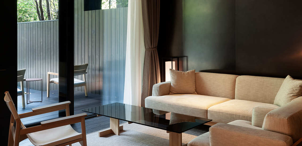 어두운 색과 오크 색을 사용해 객실에 한층 급스럽고 차분한 분위기를 연출하고 있습니다. 거실 통창 너머로 돌로 구비된 노천탕이 넓게 자리 잡고 있어서 매우 고급스러움을 느끼실 수 있는데요.
