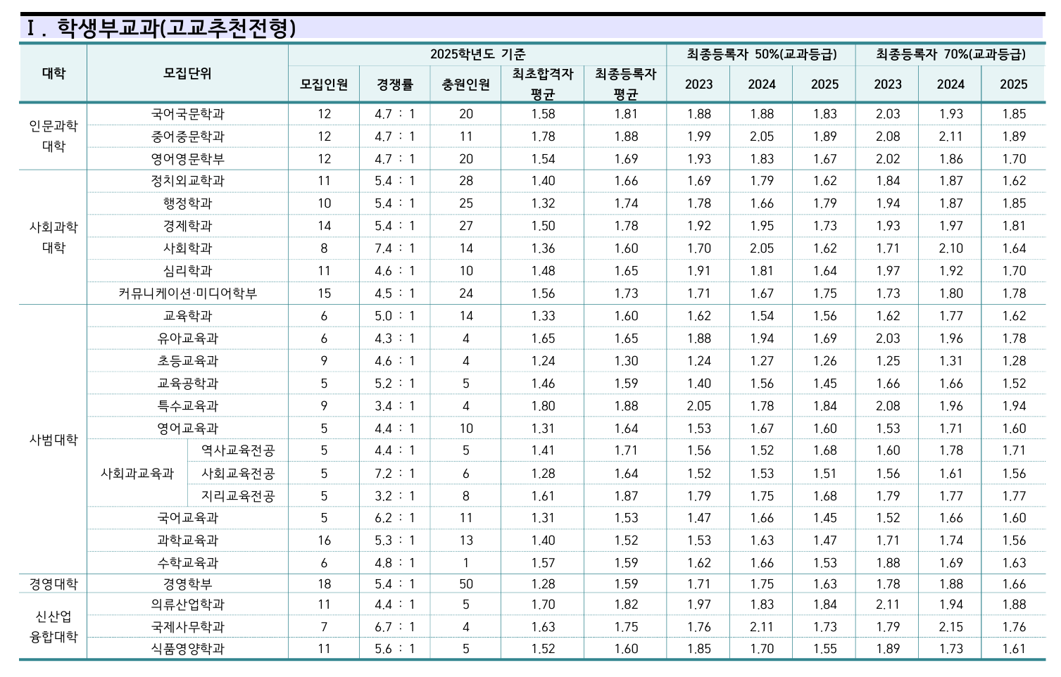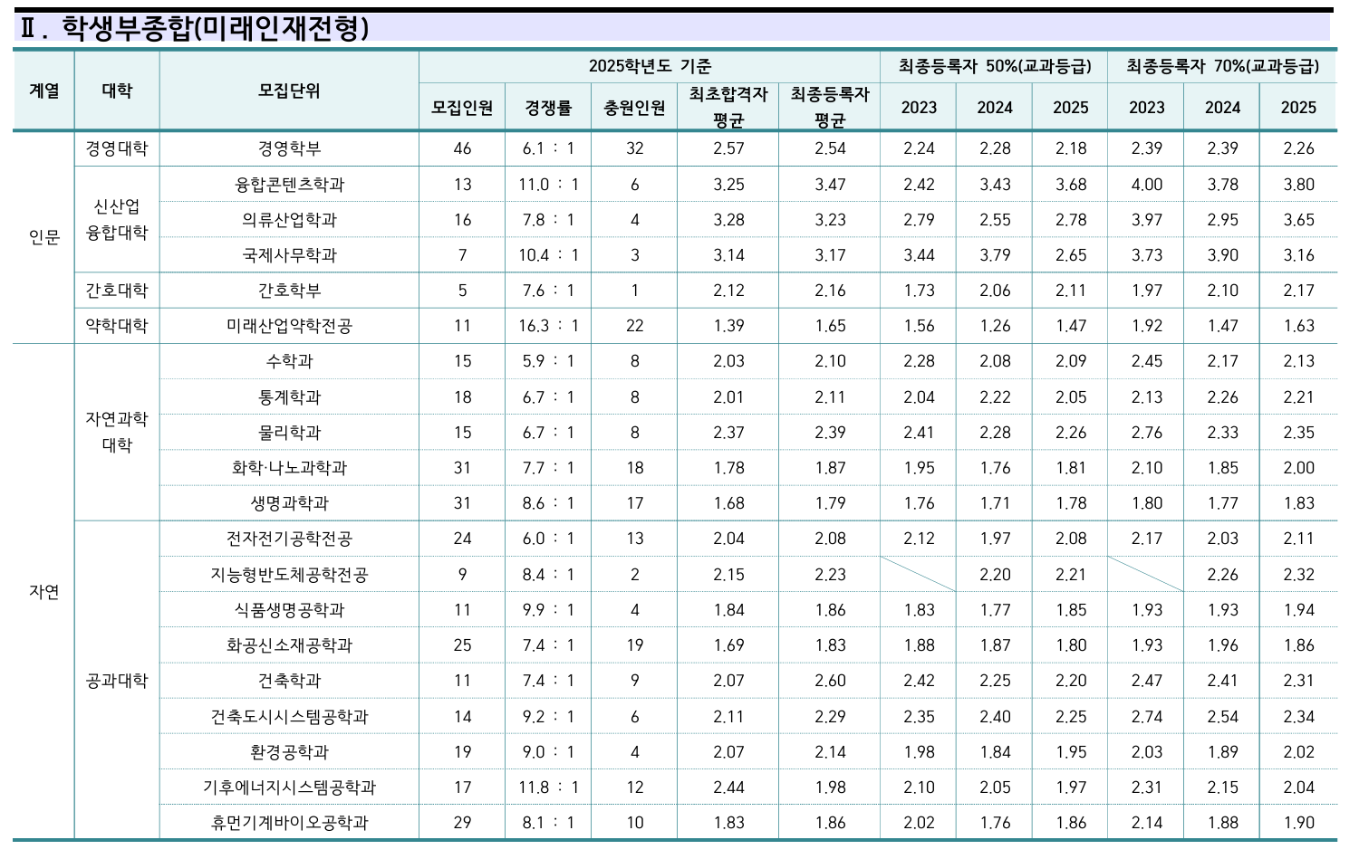 2023~2025학년도 ADIGA 데이터 기반, 고교추천·미래인재·수능 전형 결과 총정리. 학과별 모집인원·경쟁률·충원·최초/최종평균·연도별 50%/70% 컷(요약)까지 한눈에 확인.