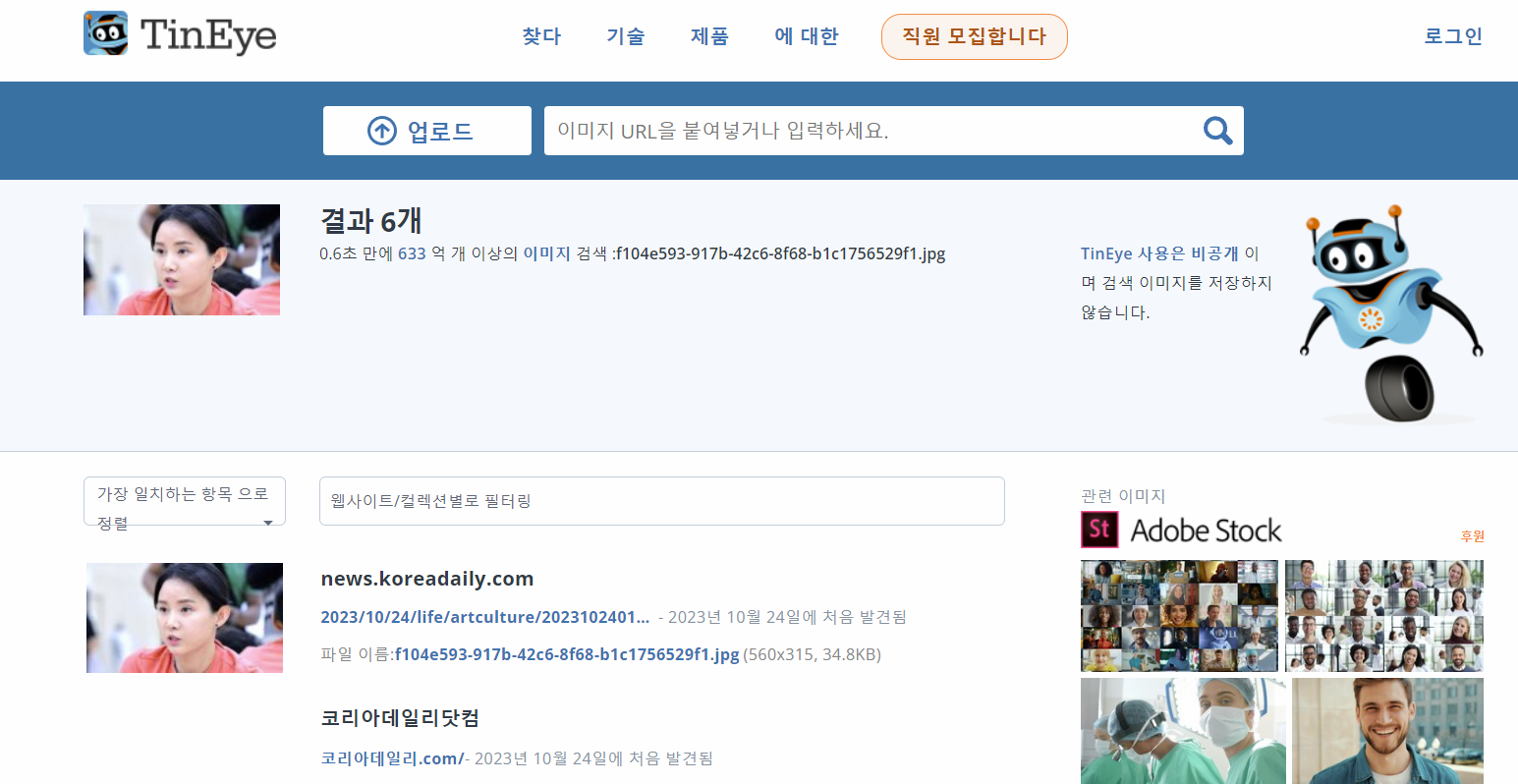 티니아이 사이트는 홈페이지에서 설명하는 것처럼 이미지인식 및 역 이미지 검색을 통해 정확한 이미지 인식결과를 제공하도록 설계되었는데요. 라벨을 매칭하거나 이미지를 추적하거나 이미지를 검증하고 모바일 이미지를 검색하는 등 이미지 검색에 특화되어 있는 엔진이라고 생각이 됩니다.