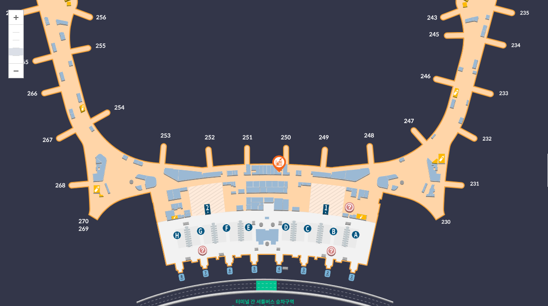 제2 여객터미널의 경우 면세점은 250번 근처에 위치하고 있습니다