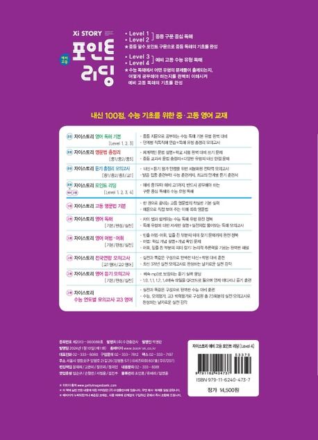 자이스토리 포인트 리딩은 각 구문을 학습한 후에 핵심 구문과 단어를 복습할 수 있도록 구문과 어휘 복습 문제를 포함하고 있습니다. 능력 향상 테스트를 통해 다양한 문제를 해결해보면서 학교 시험 준비에도 충분히 대비할 수 있습니다. 해당 자료의 저작권은 출판사에 속해 있습니다. 본 사이트에서는 오직 정답지만을 제공하고 있습니다.