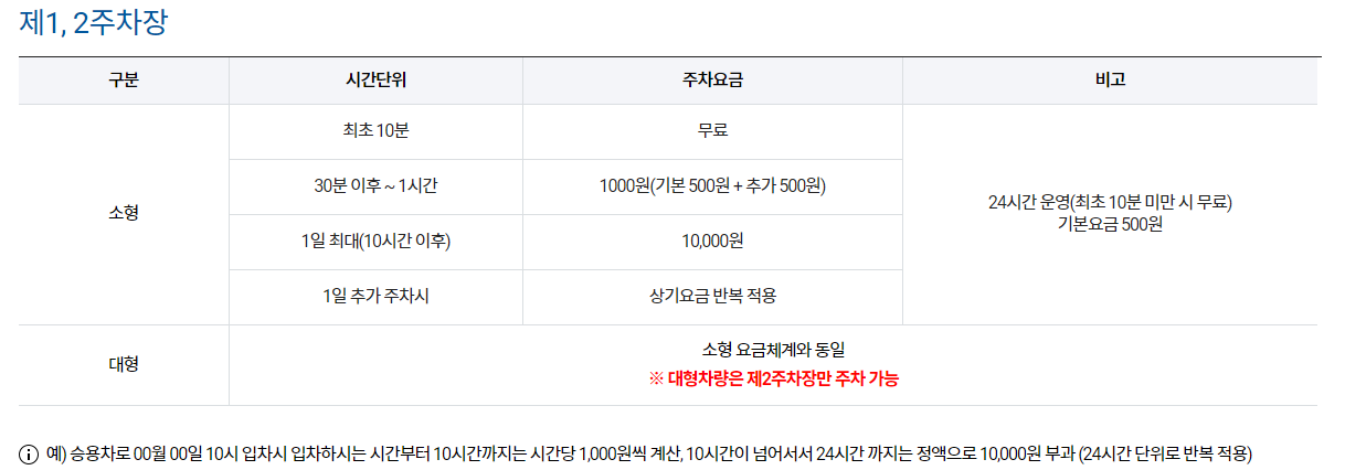 승용차인 소형을 기준으로 최초 10분간 무료, 이후 시간당 1000원씩 부과되며 1일 최대 6,000원이 부과됩니다. 1, 2주차장에 배해 40%정도 저렴한 금액으로 이용이 가능해요