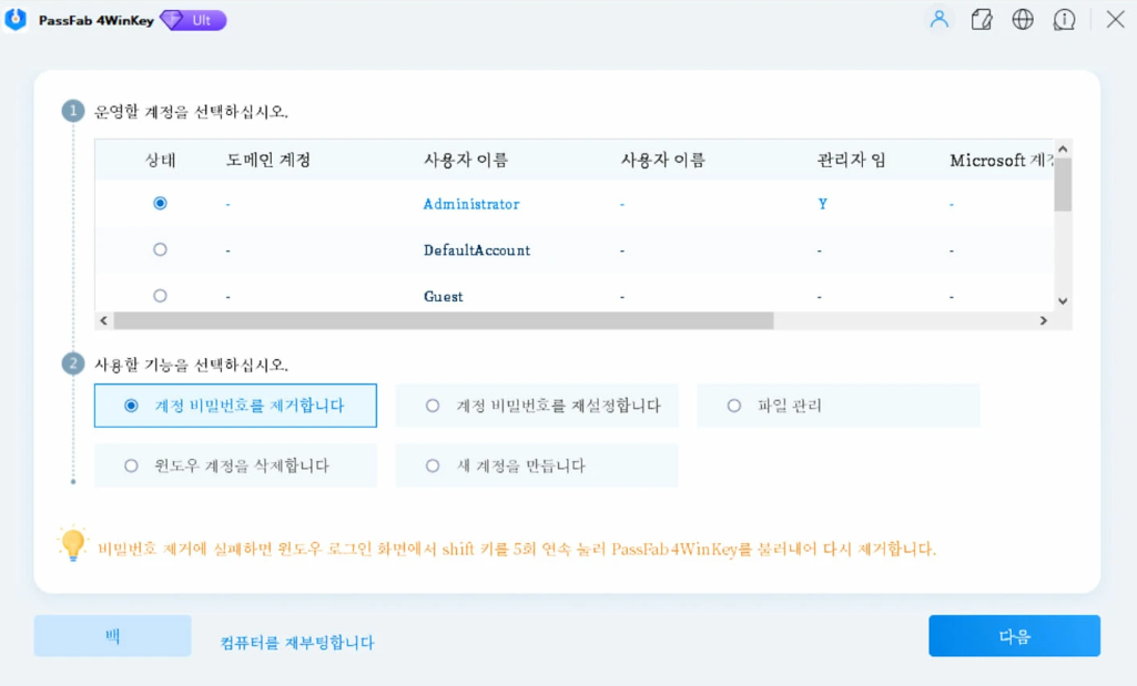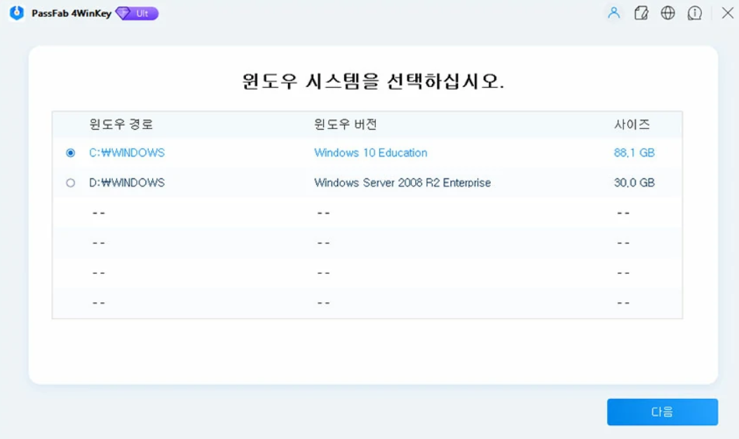 6. 로그인 암호를 잊어버린 윈도우 계정을 선택한 다음 다음을 클릭합니다.