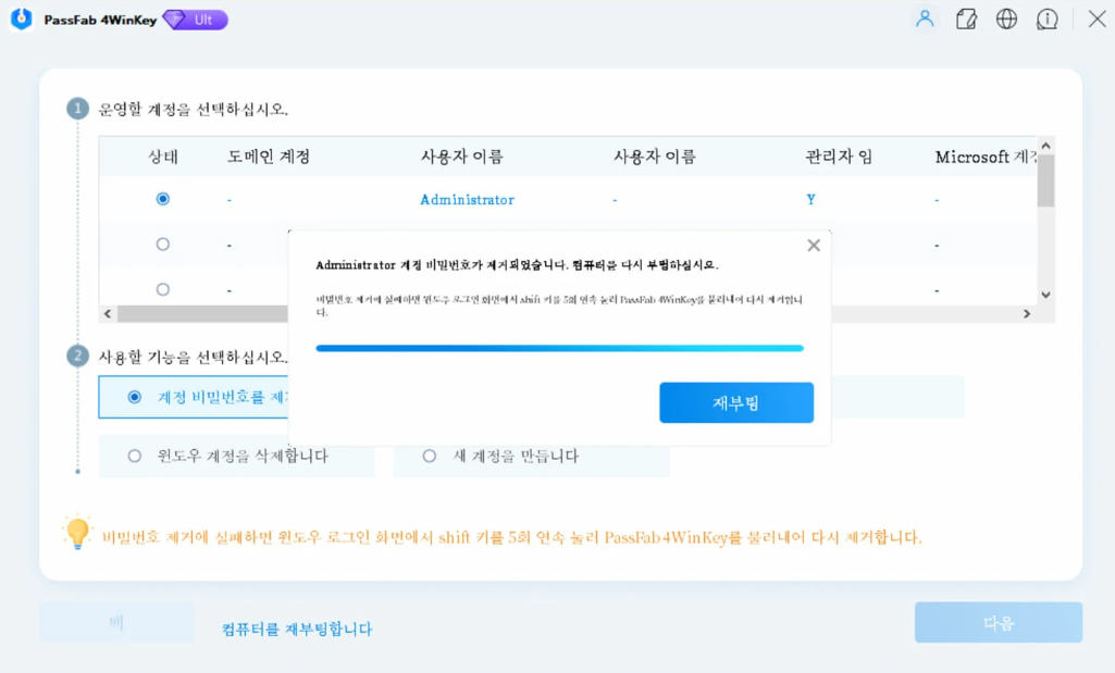 5. 마침을 클릭하고 PC를 재식작 했을 때 암호가 삭제가 되었는지 확인해 주시면 됩니다.