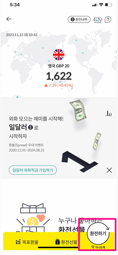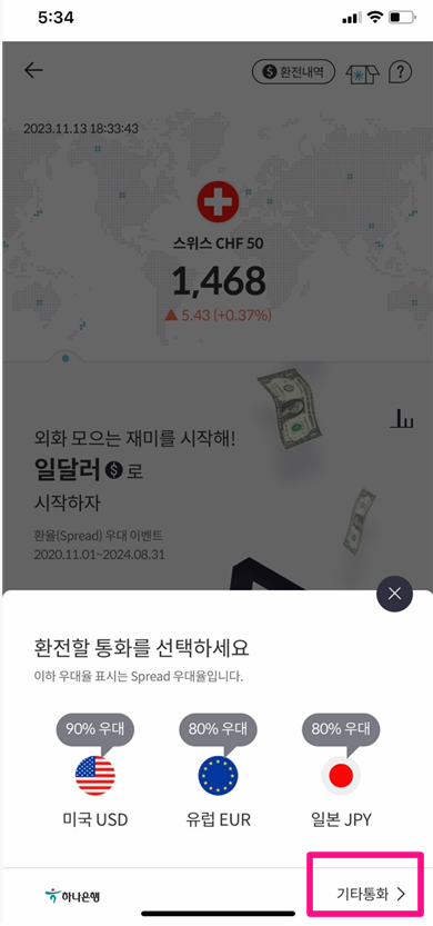 카카오페이는 하나은행과 제휴를 통해 환전 서비스를 제공하고 있어 하나은행 환전과 매우 비슷해요. 2023년 12월 31일까지 환전 우대 이벤트가 진행중이니, 카카오페이 환전 서비스를 이용해 보시는 걸 추천드립니다.