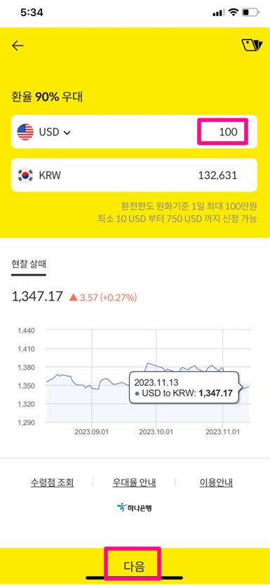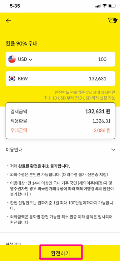 12. 결제금액, 적용환율, 우대금액 확인 후 환전하기 클릭.