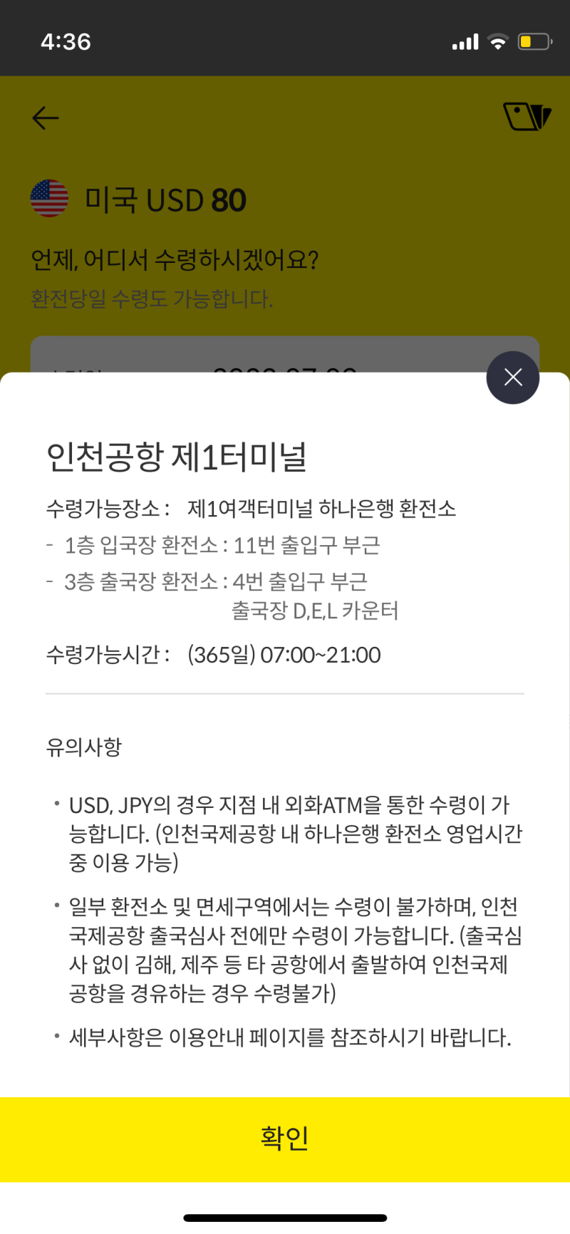 카카오페이를 통해 하나은행 환전 후 수령방법은 매우 간단합니다. 위에 설명한 카카오 페이 환전 과정을 그대로 따라하신 후 수령 지점을 인천공항 제 1터미널 지점으로 선택하신 후 바로 수령하시면 되거든요.